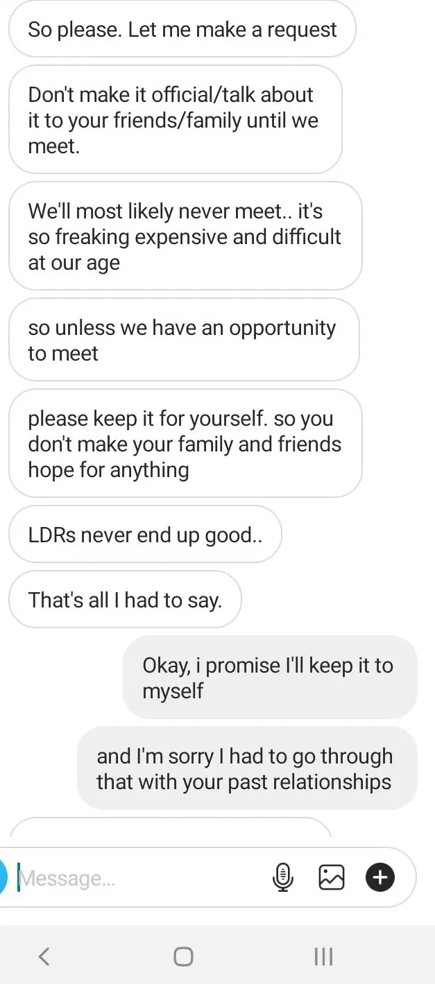 I had a few more online relationships after that. and by 'few', I mean two. the second one was during COVID, and lasted about 4 months. However, we still talk to this day, so I won't give too many details. This person was actually American