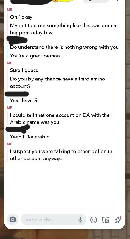 We met on Amino (rip) and I had noticed another profile that was active on an Amino group (think Facebook group). The profile picture was the same as his Instagram profile picture. And the person had the same vernacular. I screenshotted everything and went sniffing for any comments. I noticed he'd commented affectionate stuff on a girl's page. All this evidence was gathered, but I didn't confront him. At this point, we hadn't spoken for 4 days or so, which is like 2 weeks in LRD terms. When he eventually messaged back, he talked about how he wasn't ready for a relationship, then I said...: